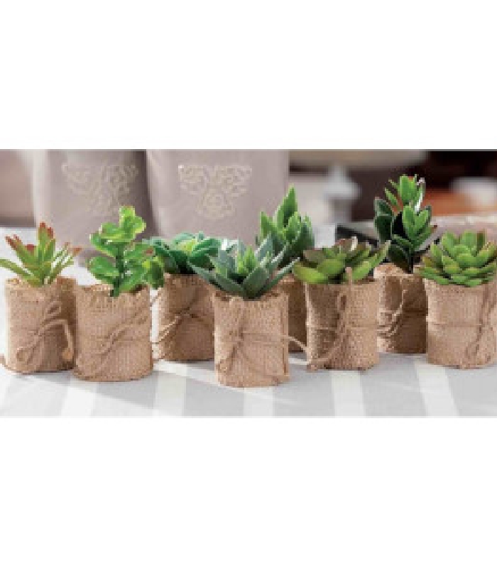 PIANTINA BORSA JUTA EXP32 A8M D7XH9 Piantina grassa finta, in borsetta di juta, assortita in 8 modelli differenti da poter richidere al momento dell'acquisto. Dimensioni: diam 7xH9 cm.