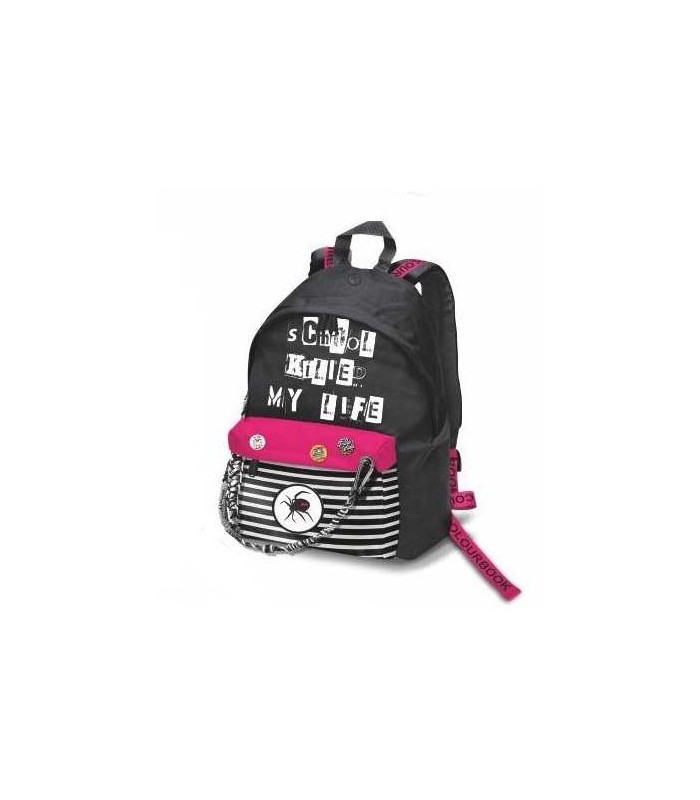 ZAINO AMERICANINO KILLED FUCSIA -Zaino modello americano per la scuola, -Colore: nero e fucsia -Con tasche, catena e spille. -Molto capiente e adatto ai teenagers.