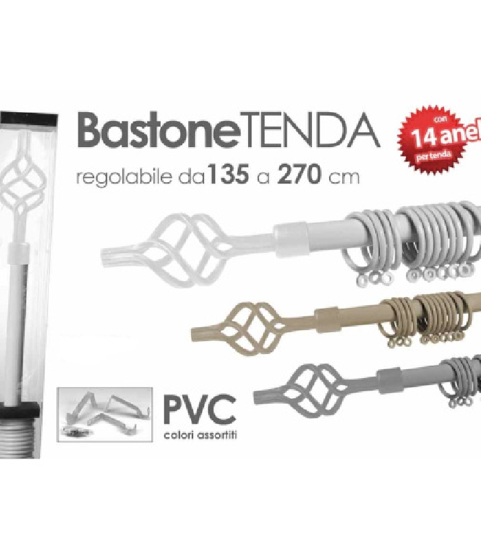 ASTA 135X270 CM 2 FIN+3GAN+14AN -Bastone per tenda regolabile -Dimensioni: cm 135-270 -Assortito in vari colori da poter richiedere -Con 14 anelli -Con 3 ganci -In PVC