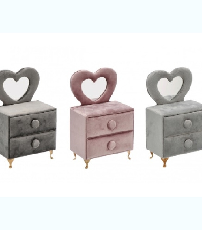 PORTAGIOIE VELLUTO A3COL CM15X9X24H -Portagioie in velluto -Con cassetti e specchio -Modello cuore -Assortito in 3 colori da poter richiedere -Dimensioni. cm 15x9x24H