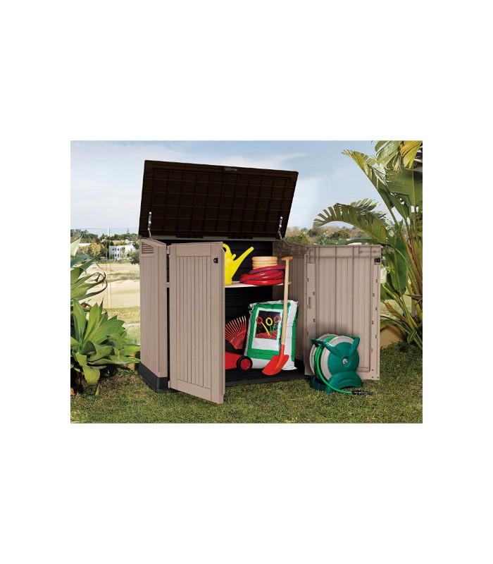 BAULE PORTA ATTREZZI STORE IT OUT MIDI BEIGE -Baule porta attrezzi da estermo mod. Midi -Colore beige -Capacità: 845 lt -Può contenere fino a 2 bidoni da 200 lt -Chiusura lucchettabile -Dimensioni: cm 130x74x110H