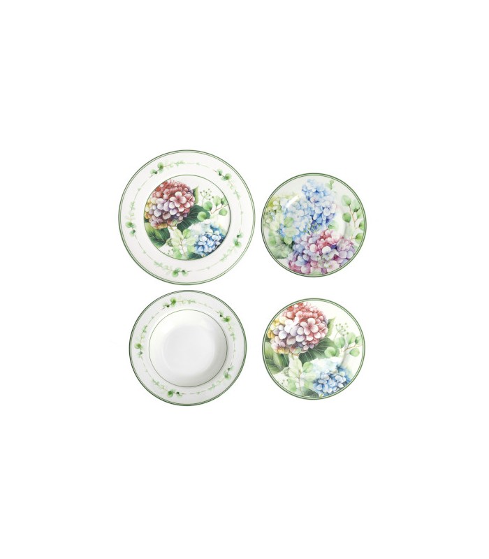 TAVOLA 18 PZ FLORA PORCELLANA -Servizio piatti Brandani -Modello Flora -In porcellana -Composto da 18 pezzi -Decoro con ortensie e delicate foglioline