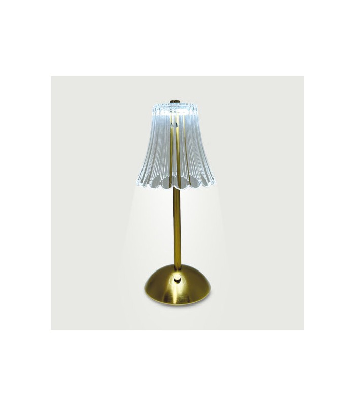 LAMPADA LED H.30 58428 -Lampada da tavolino a Led -Con gambo dorato in metallo -Con paralume trasparente in acrilico -Dimensioni: diam 13x30H cm -Con sensore touch -Ricaricabile.