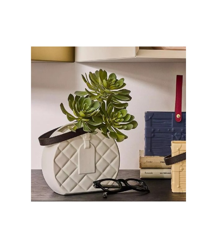 BORSETTA TONDA BIANCA H15 CERAMICA BAG -Vaso decorativo portapiantina -A forma di borsetta -Colore bianco con manico nero -In ceramica -Dimensioni: cm 18 x 7 x 15H -Marca: Fontebasso Andrea
