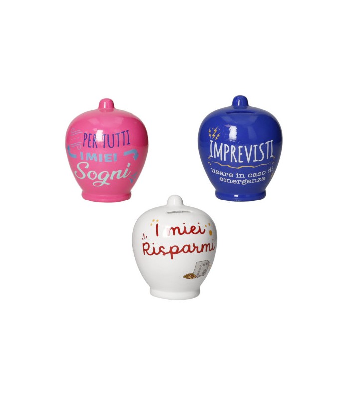 SALVADANAIO CLASSICO COLORI E FRASI ASSORTITE DOLOMITE -Salvadanaio Brandani -In dolomite -Dimensioni piccola -Assortito in 3 modelli da poter richiedere