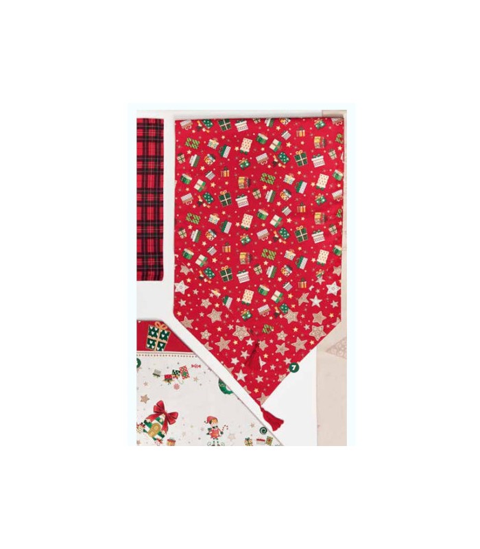 STRISCIA A PUNTA ELFOMAGIA CON PACCHETTI E STELLE CON NAPPA ROSSA CM 45X140 -Runner natalizio Brandani -Collezioen elfomagia -Colore rosso con pacchetti e stelle colorate -Con nappine rosse -Dimensioni. cm 45x140 -100% cotone.
