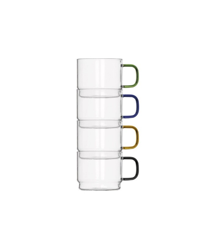 TAZZINA BRIDGE IMPILABILE COL. ASSORTI 4 PZ. IN VETRO -Set da 4 tazzine caffè Brandani -Impilabili e salvaspazio -In vetro trasparente con manico colorato -Modello Bridge -Capacità: 1 ml -Lavabili in lavastoviglie