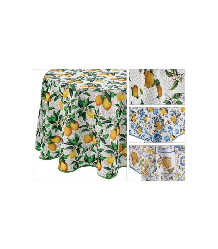 TOVAGLIA ANTIM SICILY A4DEC DIAM160 -Tovaglia rotonda antimacchia -Modello Sicily -Assortita in 4 decori differenti da poter richiedere -Fantasia Limoni -Dimensioni: diam 160 cm